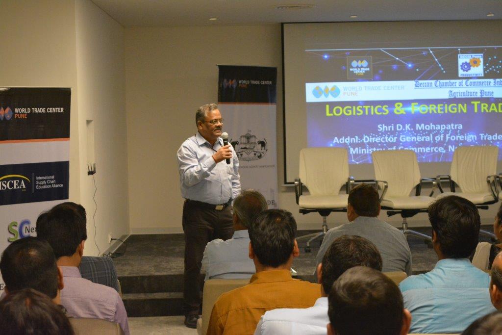 Mr. D.K. Mohapatra, Addnl. Director General of Foreign Trade from Ministry of Commerce, Govt. of India, New Delhi outlined the Indian government initiatives in Logistics & Foreign Trade at an industry seminar held at WTC Pune. Event was jointly organised with Deccan Chamber of Commerce and Industries (DCCIA) as Partner. Mr. D.K. Mohapatra delved on how technology can be leveraged by Indian Industry to bring down the Logistics spend and improve its performance. Deccan Chambers of Commerce Industries & Agriculture (DCCIA) alongwith EXIM Chamber of Commerce and Allied Industries, Pune were co-hosts. Mr. Prakash Dhoka, Chairman and Mr. H. P. Srivastava, VC of DCCIA were present. Mr. Pradeep Kale, the newly elected President of Pune Customs House Agents Association was felicitated. Mr. Mohapatra also individually met Pune industry thought leaders and sought their support in terms of suggestions and process improvements.